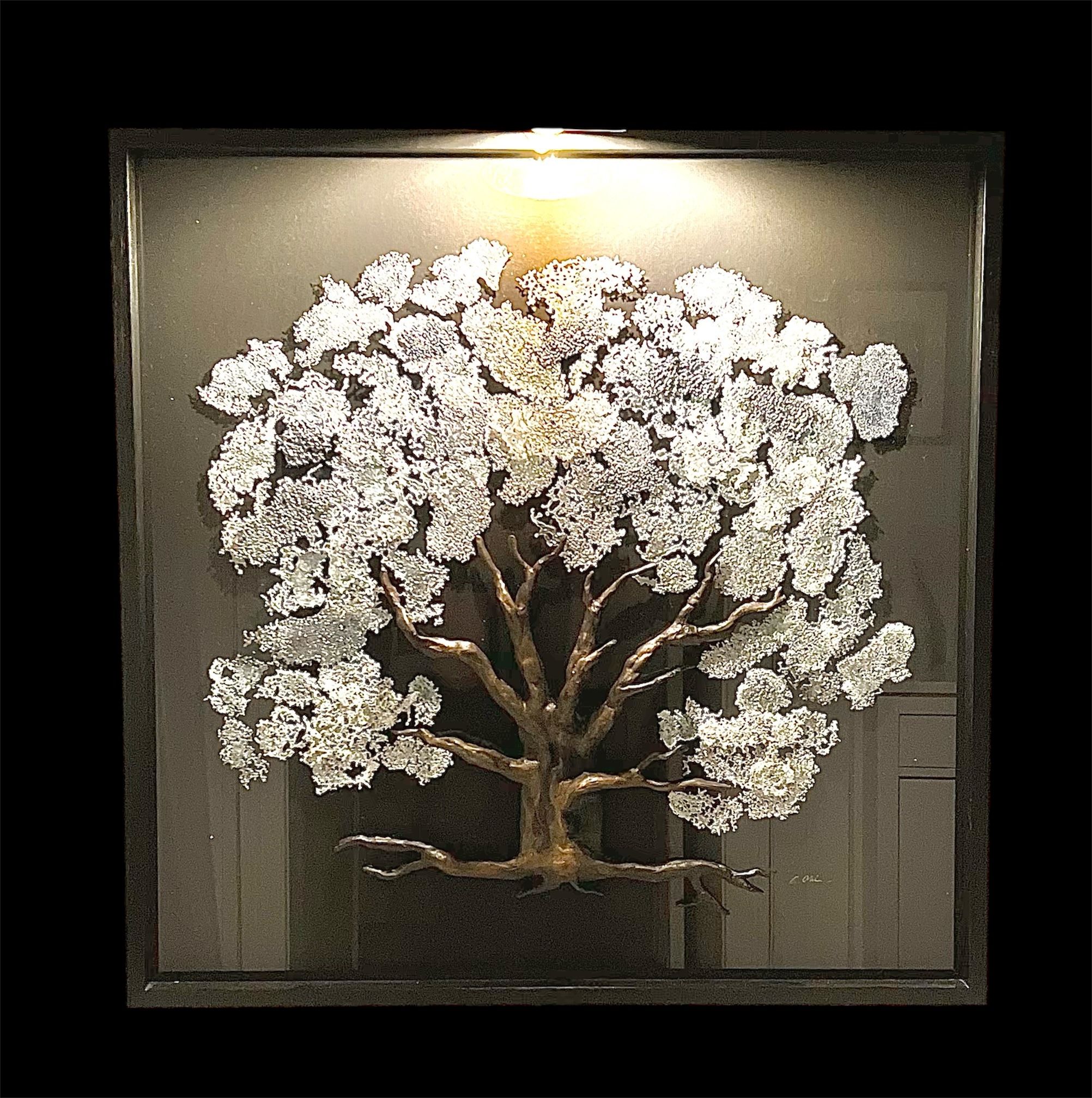 The tree trunk is crafted from ceramic, while the foliage is made of glass. It is mounted on a glass panel to enhance depth and create a sense of space within the room, and is presented in a frame.