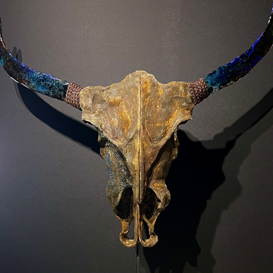A ceramic sculpture featuring horns of casted glass, combining organic form with hand carved clay.