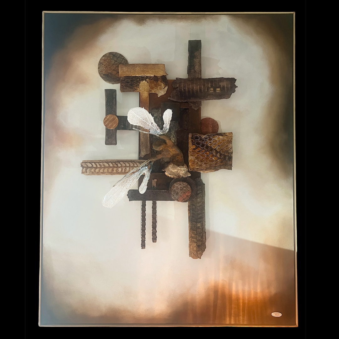 Canvas painted with acrylic, featuring a raised panel at the centre with an antique metal detail. A ceramic sculpture with wings of glass is mounted on top. The piece is framed.