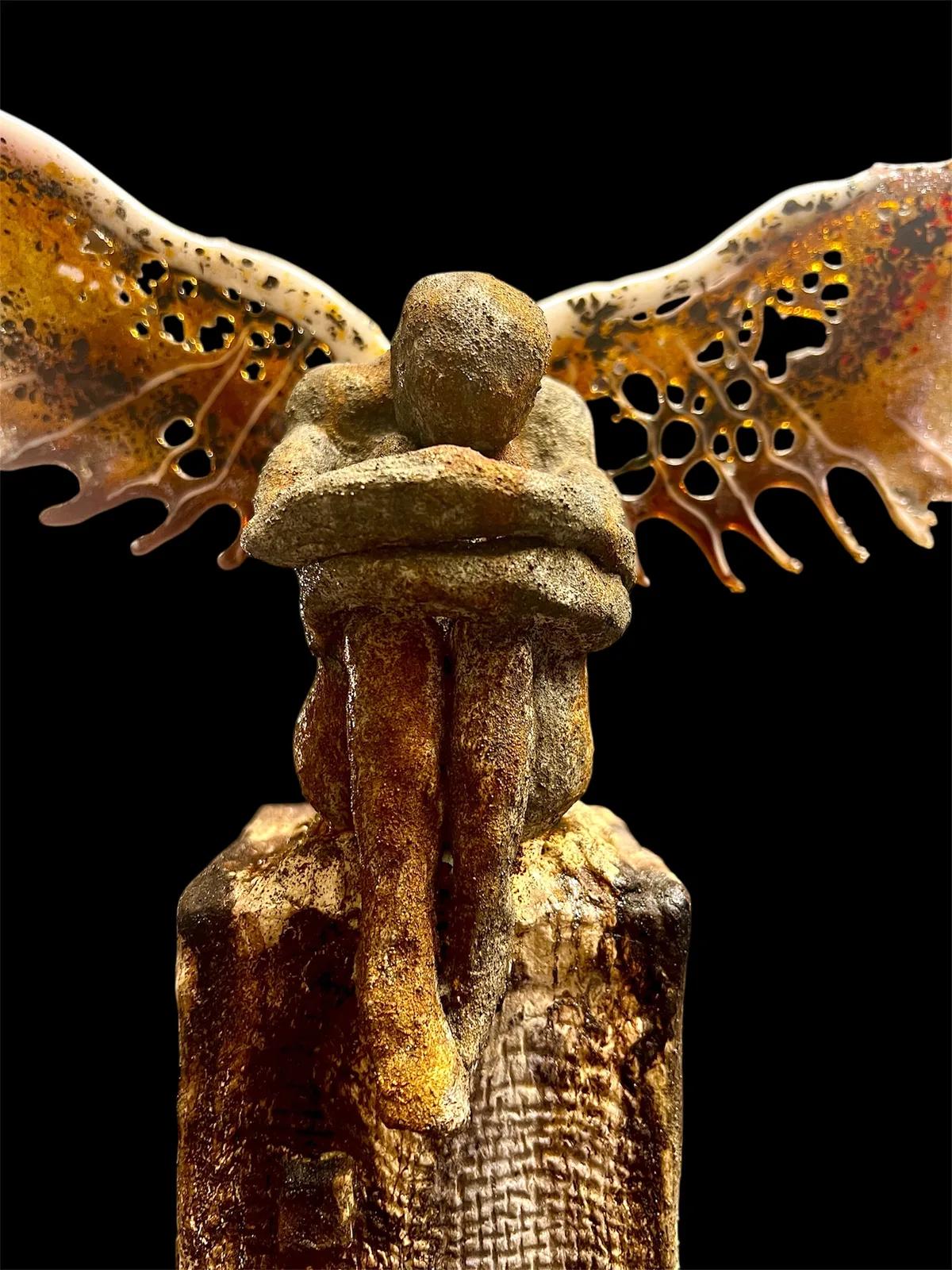 The Angel said: "So much hate and darkness in the world. I'm tired but I will never stop watching over you." A ceramic sculpture with wings of glass.