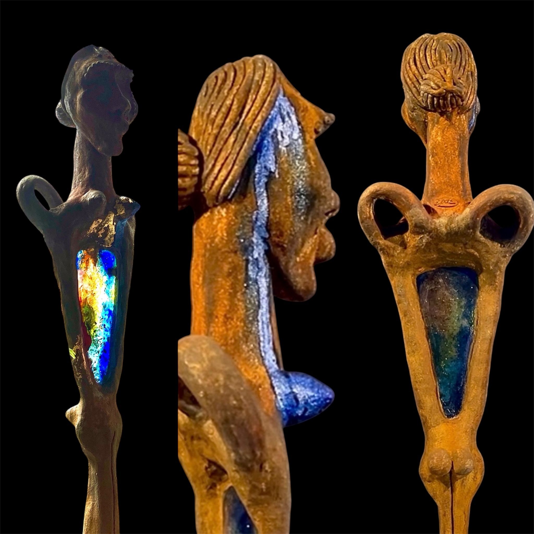 A ceramic sculpture with a wing of glass, permanently mounted on a stand. The figure carries a sense of ancient ritual and quiet authority.