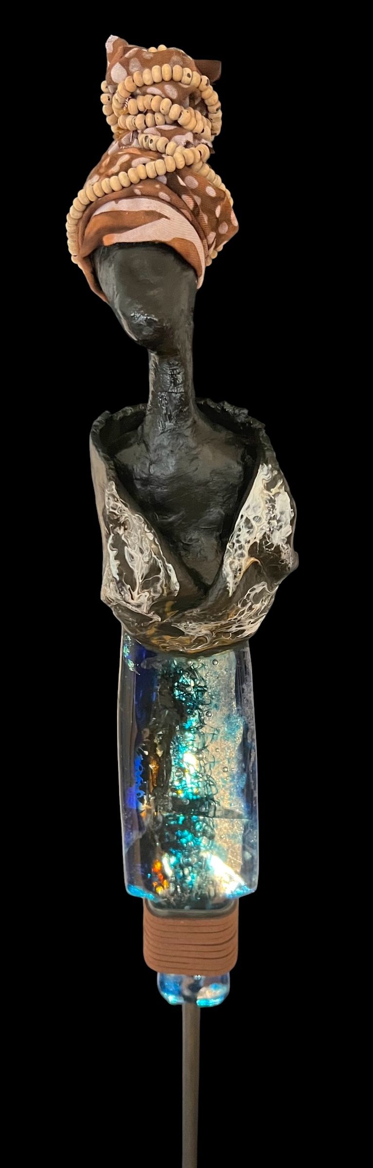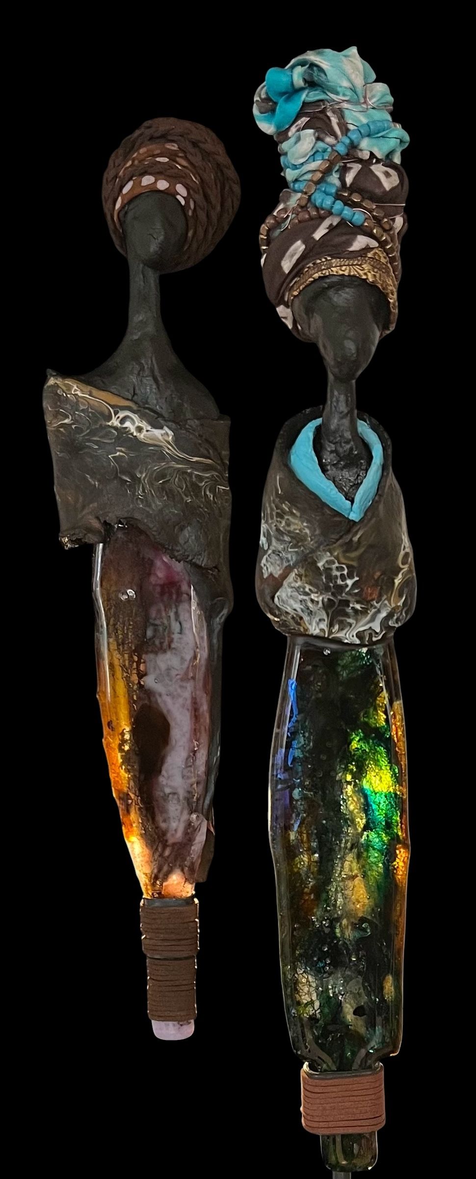 Sculptures in casted glass with ceramic upper bodies painted in acrylic. Each figure wears a headdress made from South African fabric. Mounted on metal stands.