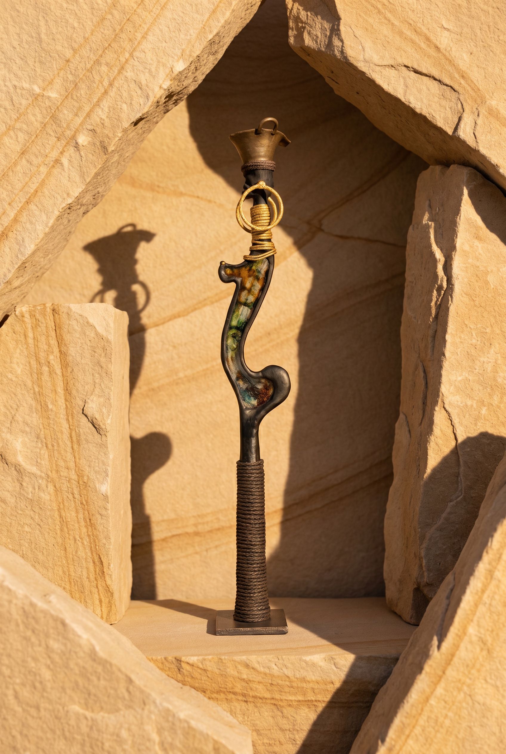 A ceramic sculpture combined with casted glass, mounted on a metal stand. The piece is designed to evoke the feeling of an archaeological discovery, an object unearthed, carrying a sense of history and mystery.