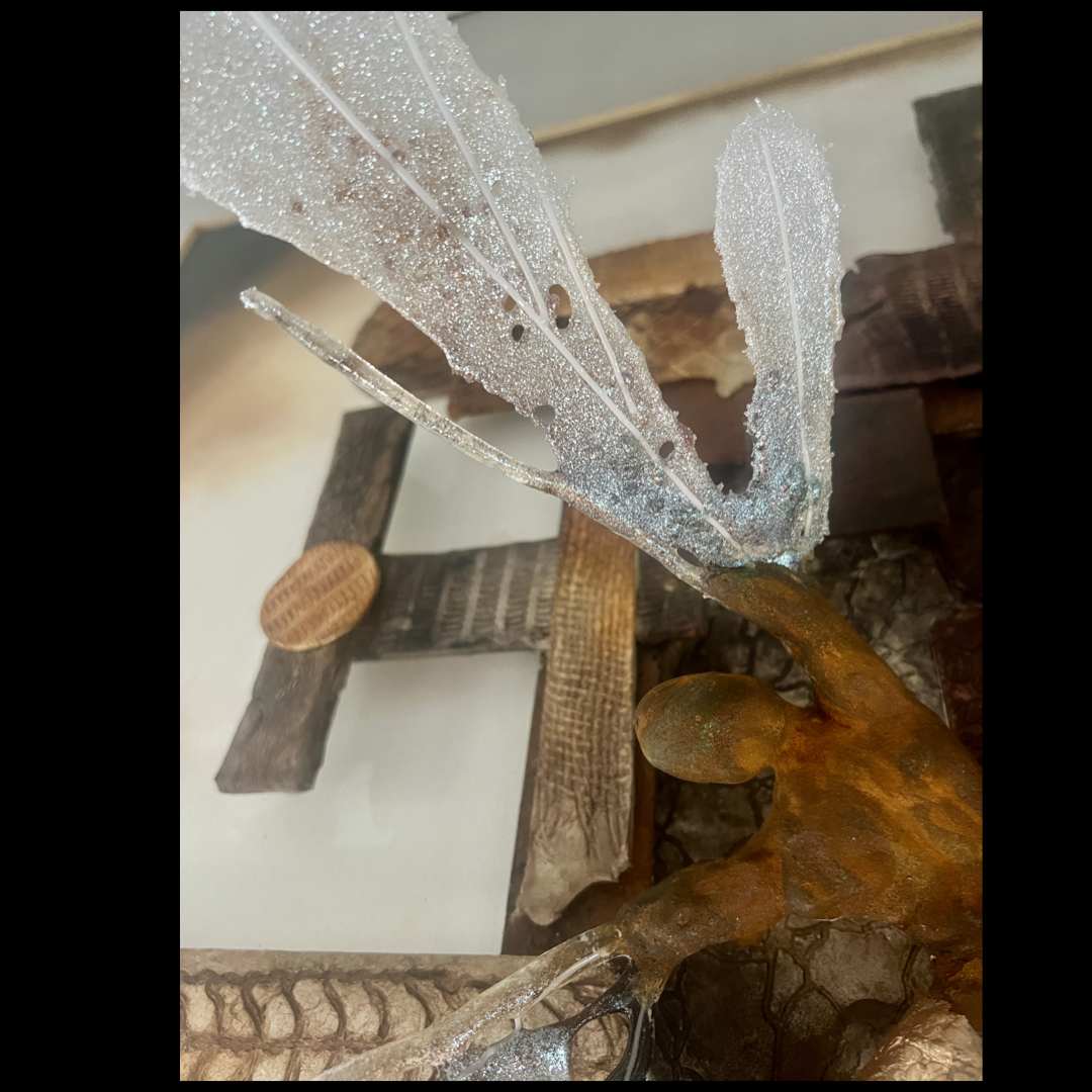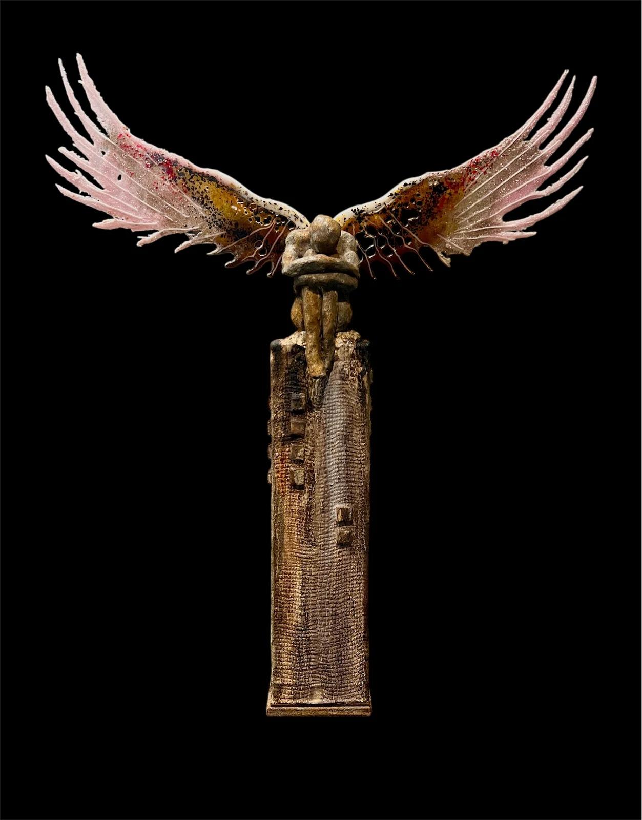 A casted hand cradles a clay sculpture with wings of glass. The canvas is covered with clay and painted with acrylic and a rust-activating agent, adding raw, evolving texture.