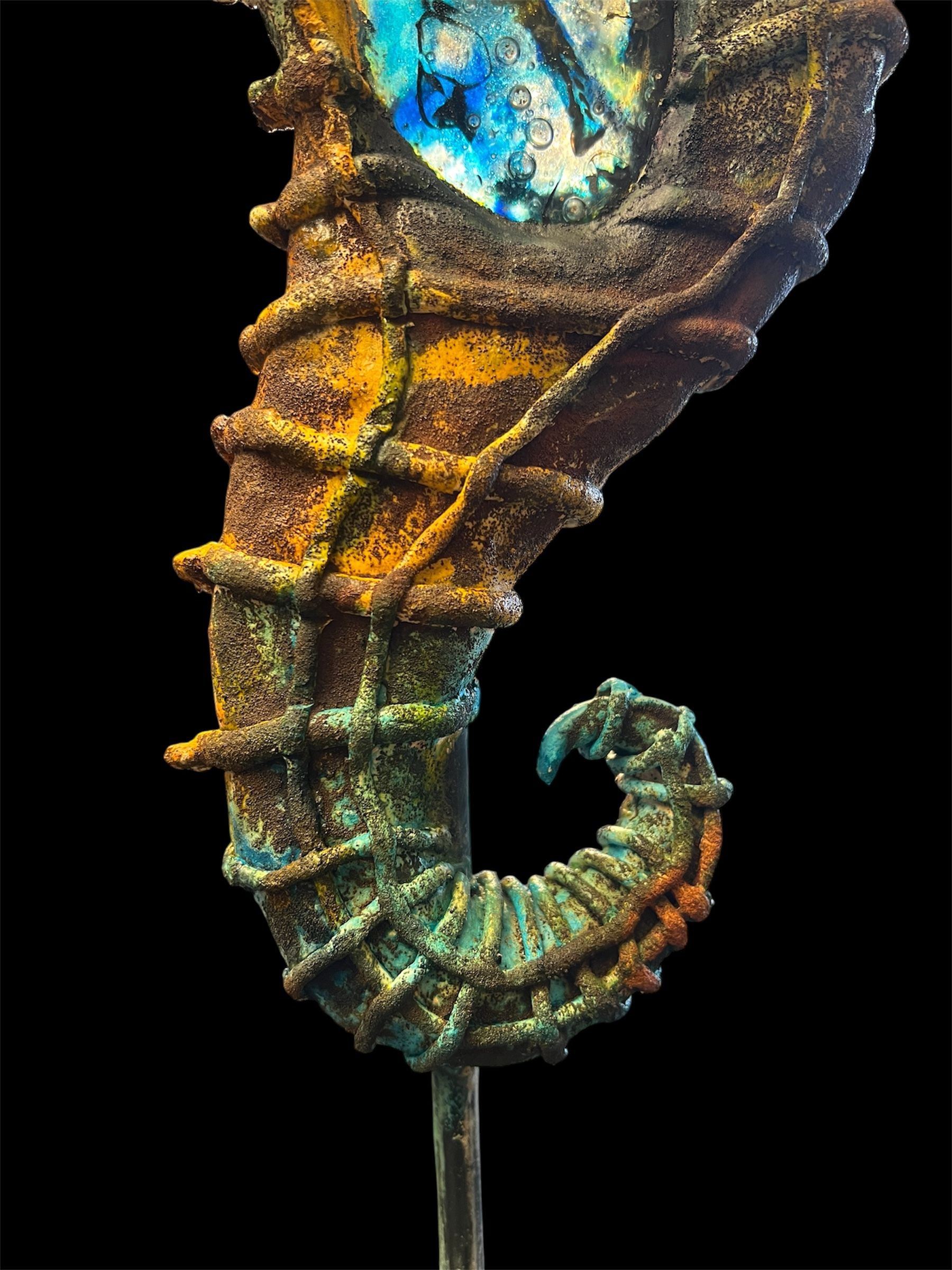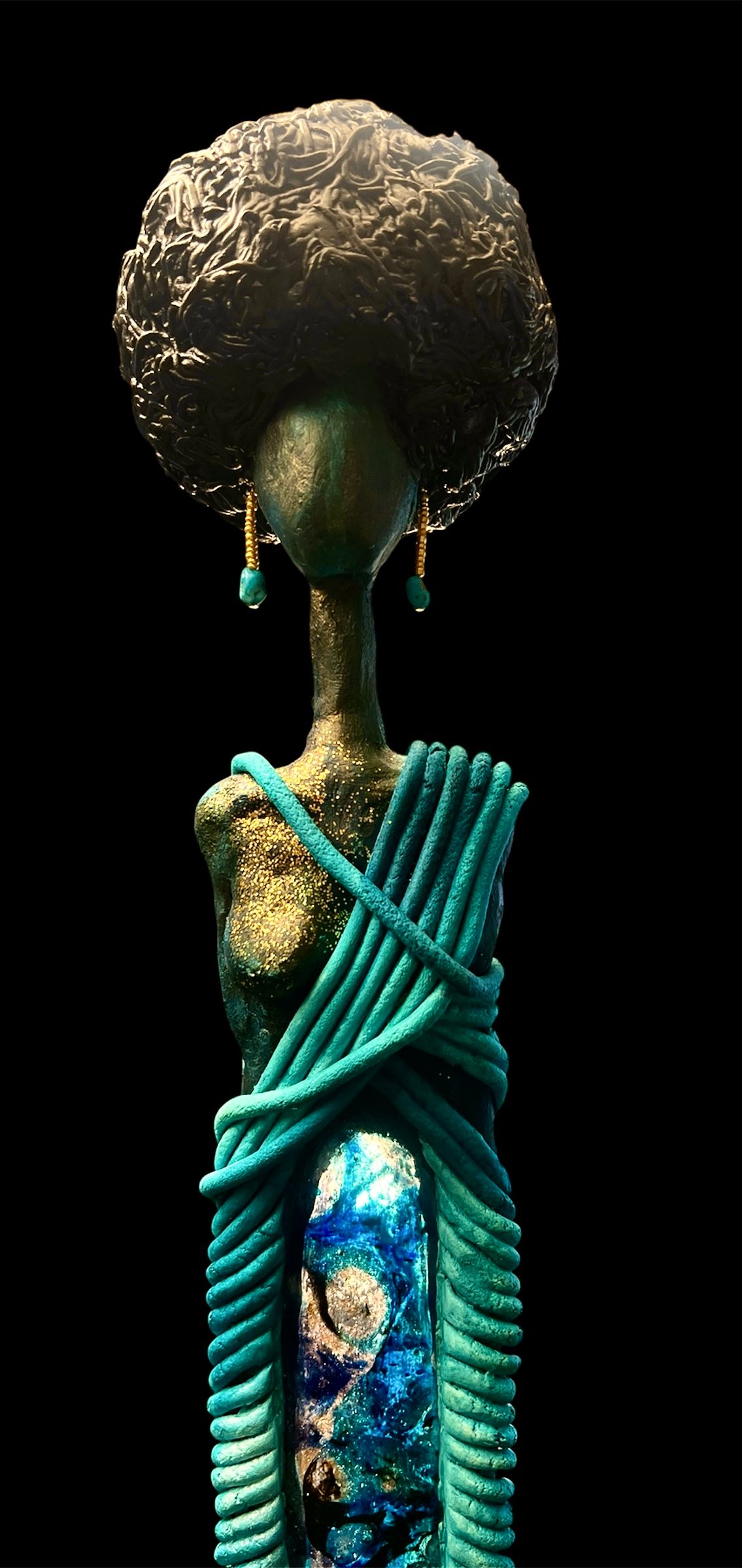 A sculpture in glass and clay. The form is brought to life through a rich interplay of gold, turquoise, and deep blue tones, creating a luminous surface that enhances both the elegance and presence of the piece.