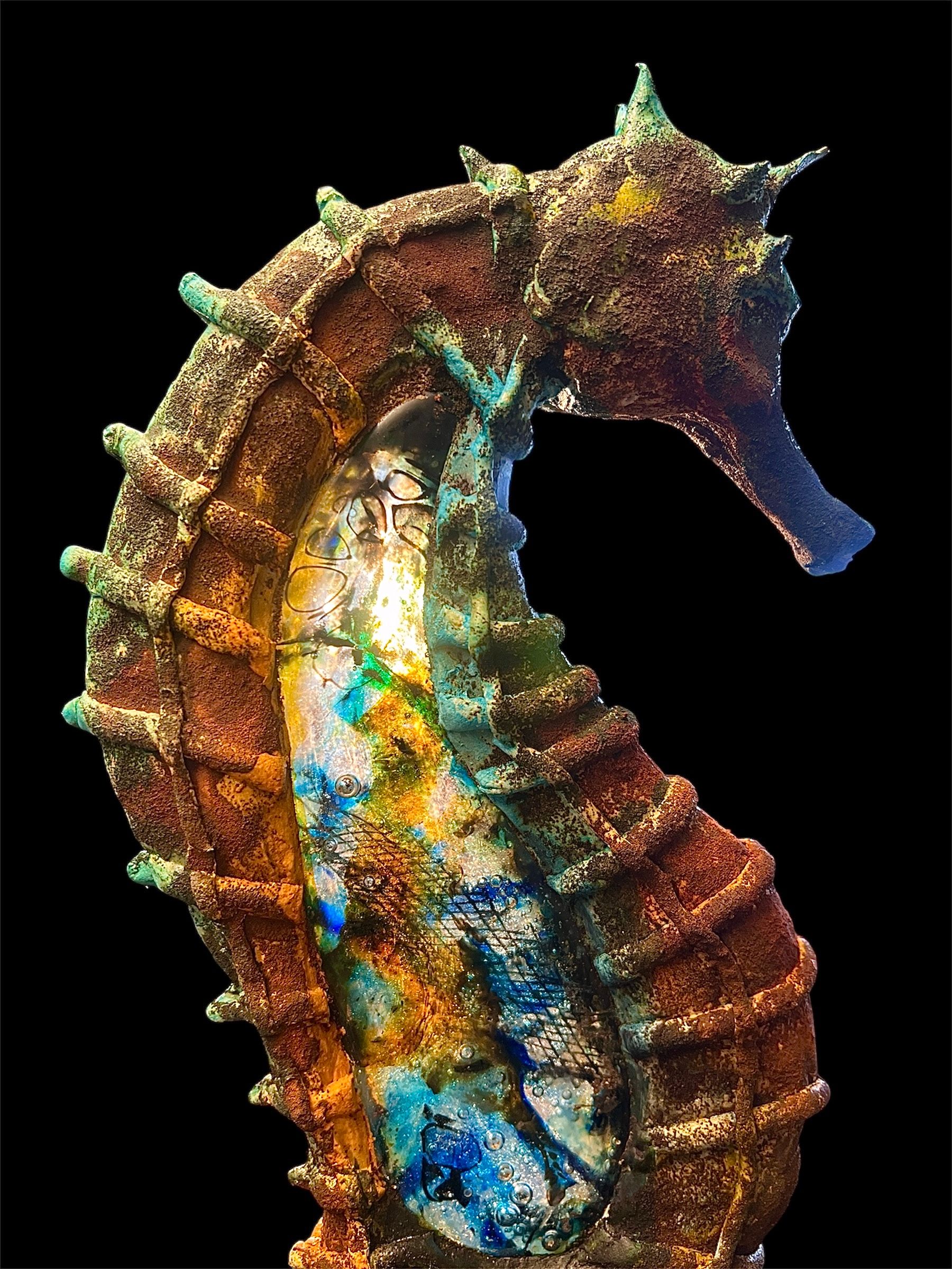 Ceramic/ casted glass sculpture.The glass body captures light like water itself—shifting between pale aquamarine and hints of sunlit gold—so that it seems almost alive. Tiny bubbles are frozen within its torso